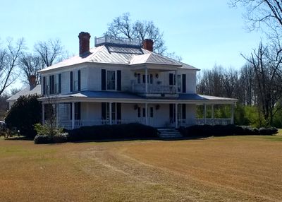 The Joshua James Blanchard House features a two-story structure with timber framing, hipped roof, and wraparound porch at 415 Carrolls Road near Warsaw.