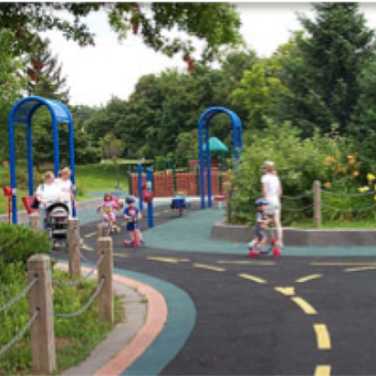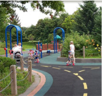 The park includes Hadley's Playground, which incorporates specialized equipment and surfaces for children of different mobility levels to play together.