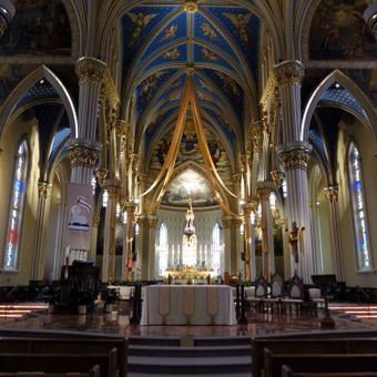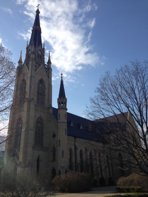 The Basilica of the Sacred Heart is a Gothic church at the heart of the university campus with soaring stone walls, pointed arches, and an ornate exterior. Inside, 44 large stained glass windows contain roughly 1,200 glass panels that depict biblical scenes and stories.