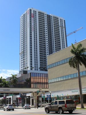 The Melody skyscraper rises 467 feet into the Miami skyline, presenting 36 floors of residential units and ground-level retail spaces through its glass and concrete structure.