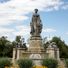The fountain's three bronze groups represent fundamental values through allegorical figures: a knight with peace, scholars with books, and romantic figures.