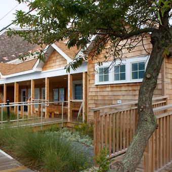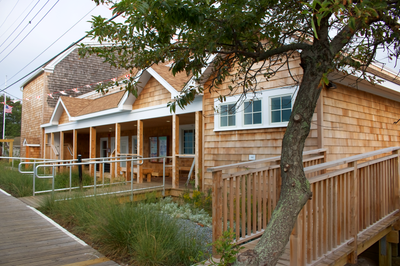 The Cherry Grove Community House and Theatre features a two-story wooden building with performance spaces and meeting rooms for local residents.
