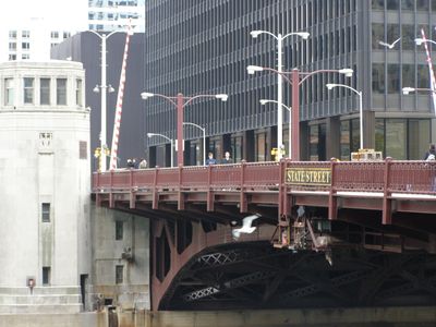 The Bataan-Corregidor Memorial Bridge spans across the Chicago River, connecting State Street between the north and south banks in downtown Chicago.