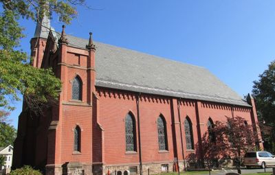 The red brick church building stands at 13 South Main Street with pointed arches, ribbed vaults, and distinguished architectural details throughout its structure.