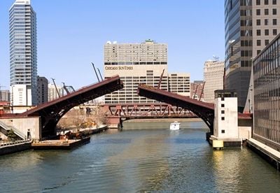 The bridge operates with a bascule mechanism that lifts one half of the roadway, allowing river vessels to pass through the Chicago River.
