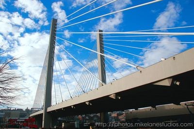 The East 21st Street Bridge extends across the Thea Foss Waterway with two 180-foot towers supporting its cable-stayed design and four traffic lanes.