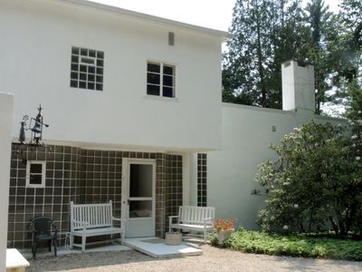Frelinghuysen Morris House and Studio is a Bauhaus structure with white geometric forms, glass blocks, and clean architectural lines set within a 46-acre estate. The property combines living quarters with artist studios and includes access to the surrounding gardens and landscape.