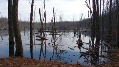 The park features 589 acres of mixed oak hardwood forest with tall red, white, and black oaks surrounding numerous streams and swamps.