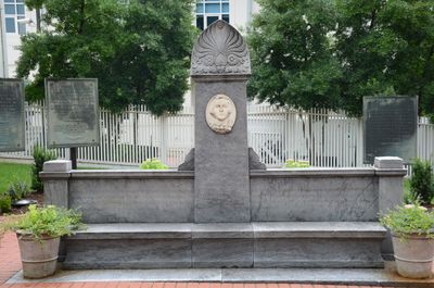 The monument includes a central gray marble shaft with a white marble relief portrait carved into its surface, flanked by stone benches.