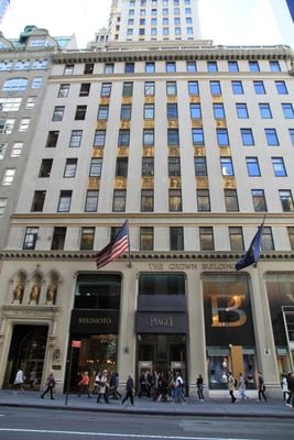 The Crown Building rises 25 floors with a height of 416 feet, featuring a French Renaissance design and limestone exterior at 730 Fifth Avenue.
