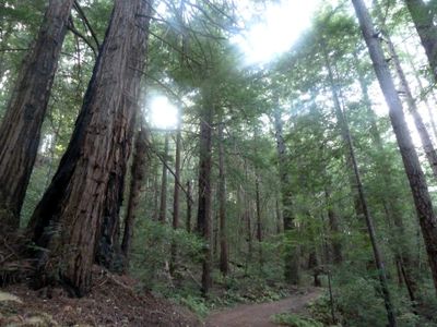 Sam McDonald County Park spans 867 acres across two distinct terrains: a redwood forest in the northwest and open ridge grasslands in the southeast.