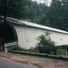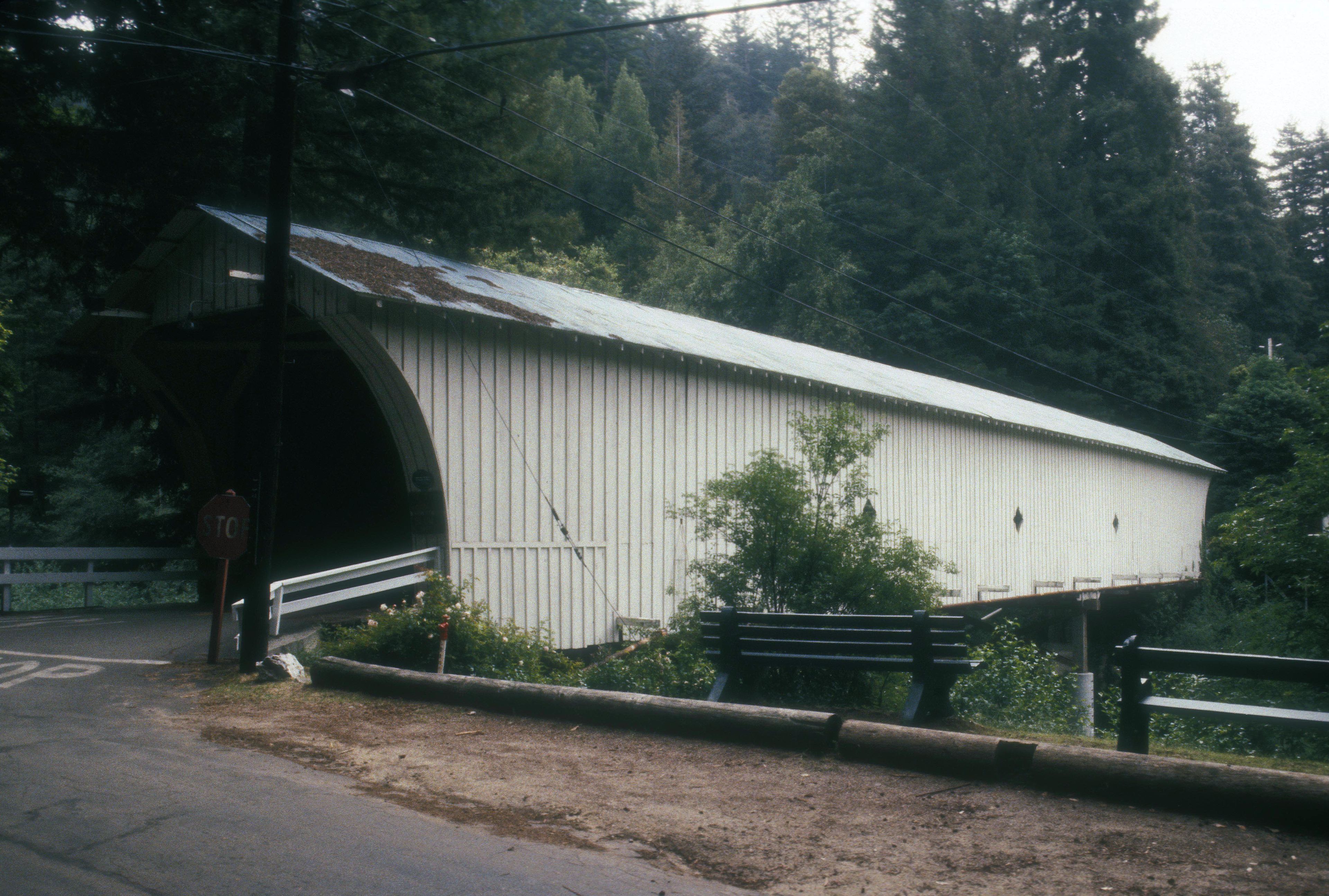 The California Powder Works Bridge extends 180 feet across the San Lorenzo River with a wooden Smith truss design and metal roof construction.