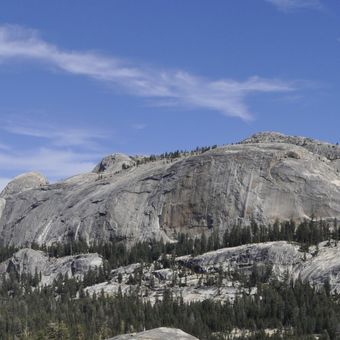 Medlicott Dome reaches an elevation of 9,665 feet above sea level and stands between Mariolumne Dome and Dozier Dome along Tioga Road.