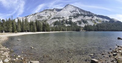 Tenaya Peak rises 10,306 feet above sea level, featuring multiple granite faces and offering clear views of the surrounding Sierra Nevada mountain range.