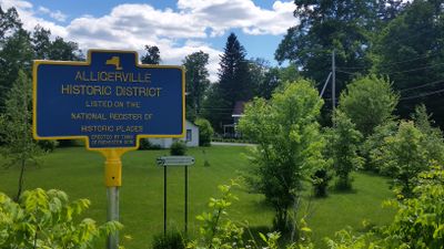 The Alligerville Historic District spans 154 acres, containing 81 buildings, 5 sites, and 8 structures within the hamlet of Alligerville in Ulster County.