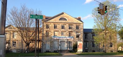 The three-story limestone structure features a central section with two-story wings at 400 State Street in Hudson, New York.