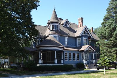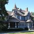 The structure includes three porches, a balcony, and a corner tower with a conical roof, representing Queen Anne architectural elements.