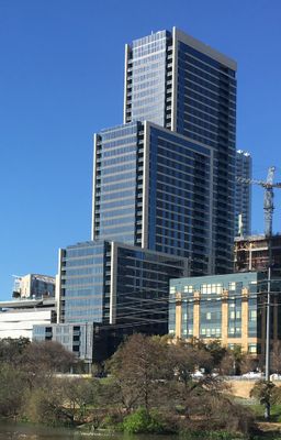The building integrates residential, office, and retail spaces, reflecting Austin's modern urban development and commitment to mixed-use architecture.