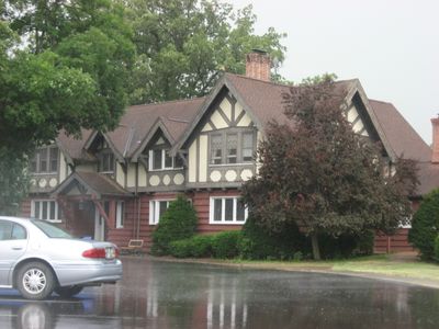 The George Ade House, built in 1904, features half-timbered construction, stucco outer walls, leaded glass windows, and beamed ceilings across fourteen rooms.