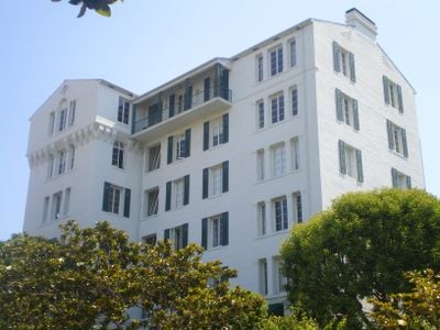 Colonial House is a seven-story residential building in West Hollywood featuring Colonial Revival and French Colonial architectural elements. The structure stands along Havenhurst Drive near Sunset Boulevard and showcases distinctive architectural details on its narrow lot.