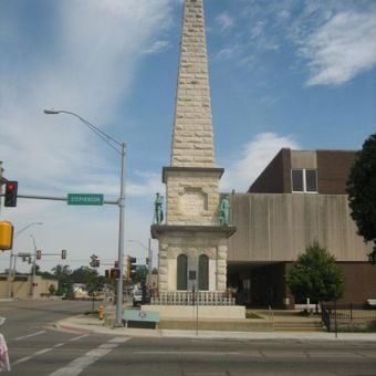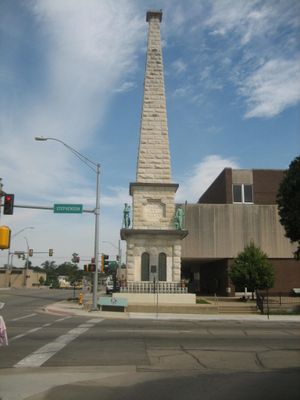 The Soldiers' National Monument features marble figures representing War, History, Plenty, Peace, and Liberty at different levels of the structure's design.
