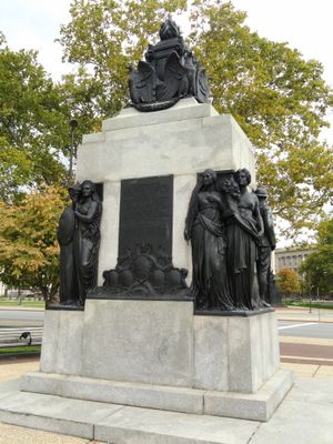 The memorial includes four female figures on the reverse side representing War, Liberty, Peace, and Plenty, along with the Seal of Pennsylvania.