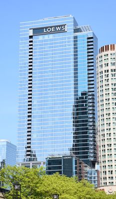 The Loews Hotel Tower is a 49-story building on Chicago's waterfront near Streeterville. It combines 400 hotel rooms with 398 rental apartments alongside multiple ballrooms, restaurants, and underground parking in one structure.