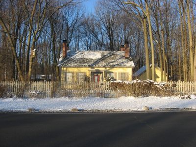 The George Washington Tomlinson House features a one-and-a-half-story design with Greek Revival and Georgian architectural elements, including four interior chimneys and clapboard siding.