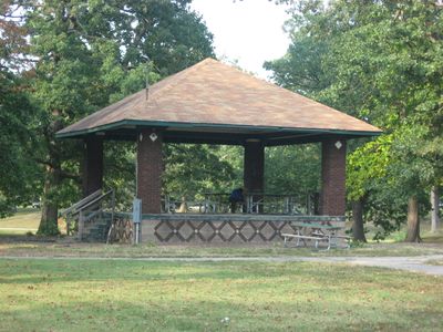 Garvin Park encompasses 87 acres of landscaped grounds with concrete bridges, stone structures, and a central bandstand near Morgan Avenue and North Main Street.
