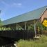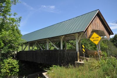 The Greenbanks Hollow Covered Bridge spans Joes Brook with a queen post truss structure featuring uneven flanking trusses of 73 feet on the western side.