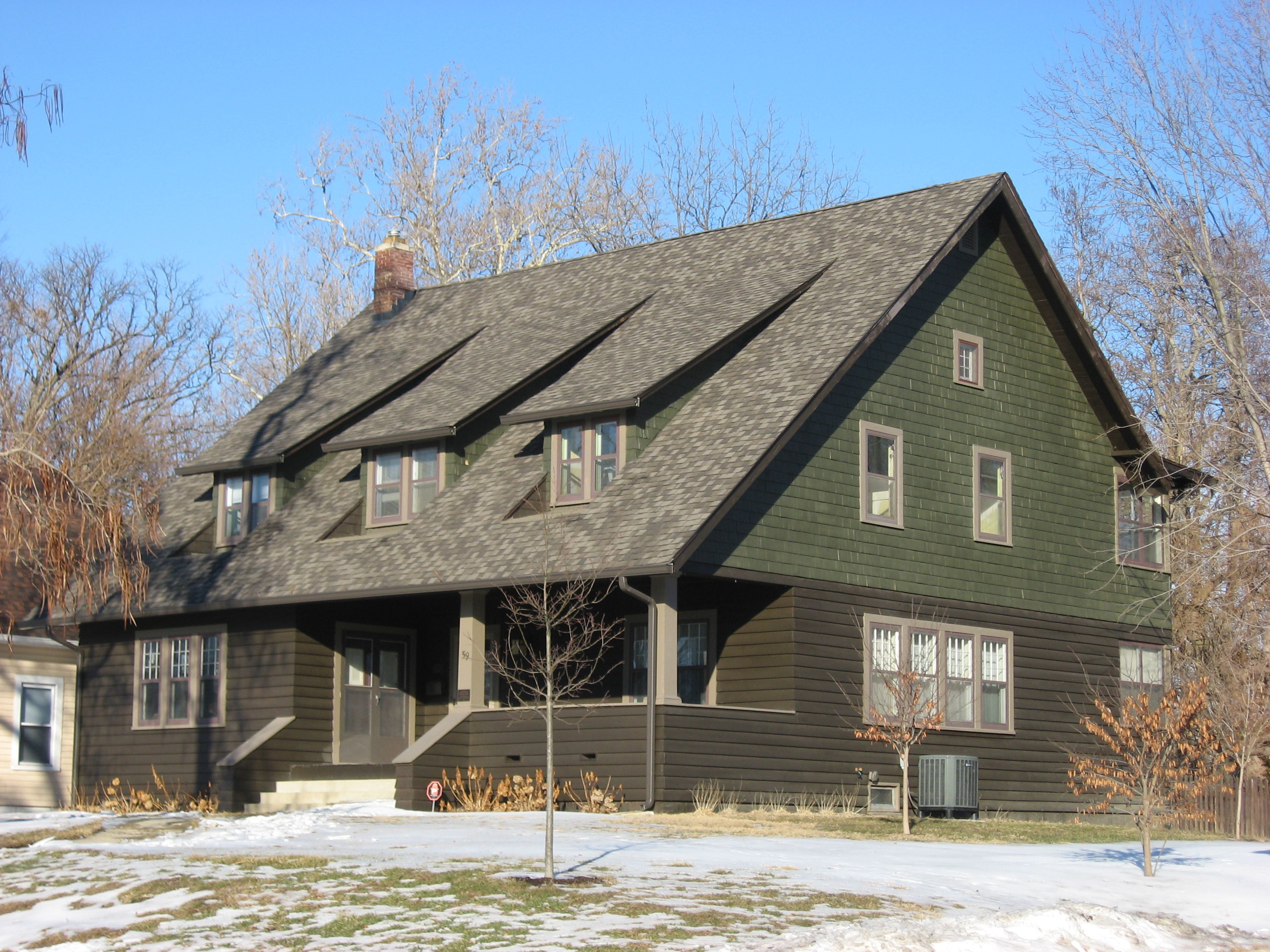 The Carlos and Anne Recker House features a frame structure with a steeply pitched side-gable roof and prominent dormers at 59 N. Hawthorne Lane.