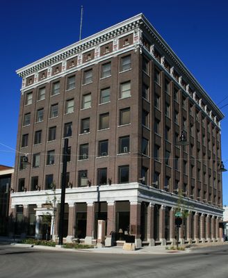 The seven-story First National Bank building exhibits Chicago School design with steel-frame construction, plate glass windows, and plain brick facades between floors.