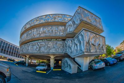 The Markel Building is an office structure defined by a striking conical shape wrapped entirely in continuous metal sheets. The three-story form creates a distinctive silhouette that stands out from the typical rectangular designs of its era.