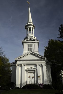 The First Church features an architectural design inspired by Christopher Wren, with a prominent spire atop the bell tower visible across the town landscape.