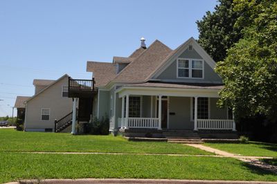 The Ralph E. Burley House features a wraparound front porch supported by round wooden columns and follows an irregular floor plan layout.