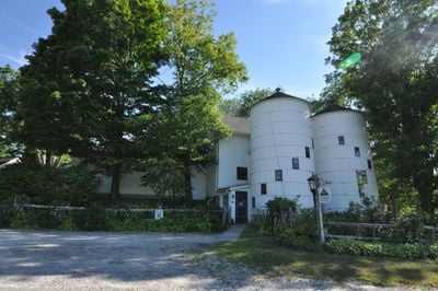 Two circular silos stand prominently at the road junction, marking the entrance to this National Register of Historic Places listed property.