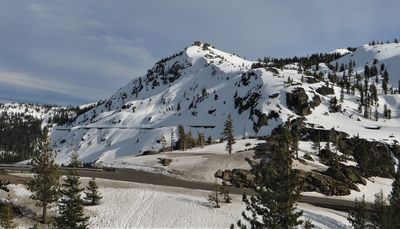 Donner Peak is a mountain summit in the Sierra Nevada, rising about one mile southeast of Donner Pass. The terrain offers hikers views of surrounding slopes and the high mountain landscape of the region.