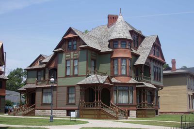 The Hume House features fourteen distinct paint colors on its exterior, complemented by fancy chimneys and varied roof lines across the structure.