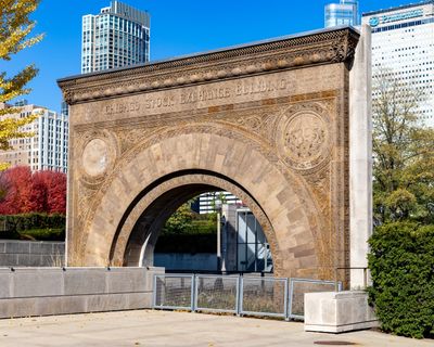 This preserved arch remains as one of the few surviving elements of the demolished Chicago Stock Exchange building, rescued through preservation efforts in the 1970s.