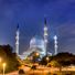 The Sultan Salahuddin Abdul Aziz Mosque is a large house of worship in Shah Alam, Malaysia, known for its blue dome and four tall minarets. The main prayer hall holds thousands of worshippers and opens onto a spacious courtyard with marble floors and fountains.