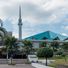 The site is a modern Islamic building in Kuala Lumpur with a tall minaret and a star-shaped concrete roof. The grounds include water features around the prayer hall and lawns with palms that provide shade.