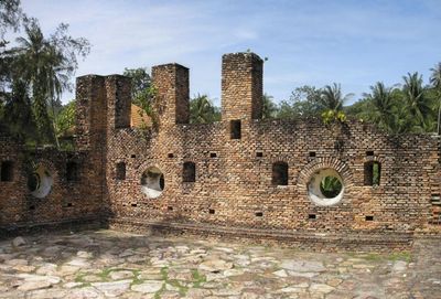 The Dutch Fort features three brick walls with round windows at regular intervals, positioned near the ocean on Pangkor Island.