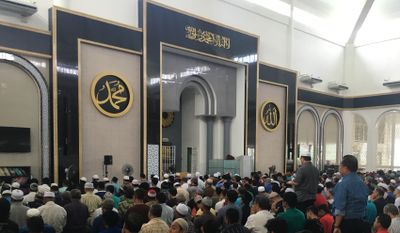 The mosque design incorporates Malaysian Islamic architectural elements, with multilingual signs reflecting the diversity of its international visitors.