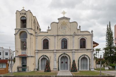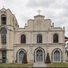 The white church building exhibits Colonial Dutch Baroque architecture with a facade incorporating both eastern and western architectural elements alongside bell towers.