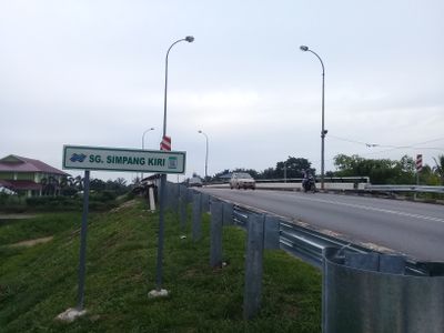 The bridge spans across Sungai Simpang Kiri river, featuring a curved design that accommodates vehicle and pedestrian traffic in Batu Pahat District.