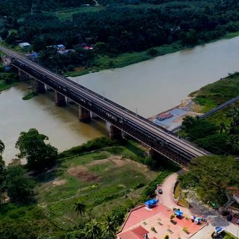 Victoria Bridge is a railway crossing over the Perak River in Kuala Kangsar built from concrete and steel. The structure rests on large foundation pillars that support the spans extending across the water.
