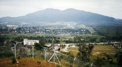 A telecommunications tower at the summit provides panoramic views of Kluang town, while the mountain houses a water park and recreational forest at its base.