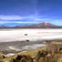 The salt flat stretches across 144 square kilometers at an elevation of 4,260 meters, featuring white salt crusts and shallow lagoons throughout the landscape.