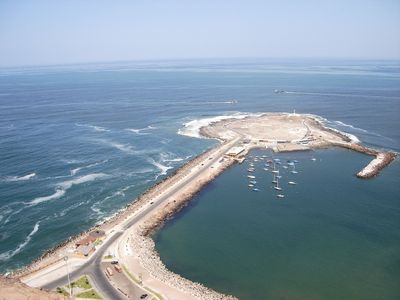 Península del Alacrán is a headland on northern Chile's coast near Arica, featuring a lighthouse that directs maritime traffic. The location holds a yacht club, old defensive fortifications, and attracts surfers and fishermen to its waters.