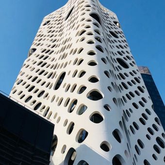 The building is best viewed from the outside as it is an office structure with limited public access. Early morning light highlights the perforations across the facade most effectively for photography or observation.